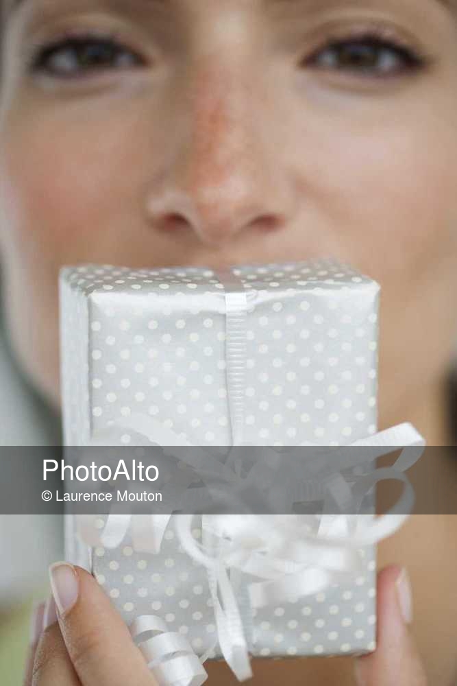 Woman holding gift in front of mouth, cropped © Laurence Mouton