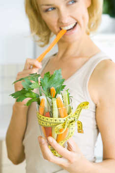 Woman lying on grass, eating carrot, carrots arranged around head, smiling at camera © Rafal Strzechowski