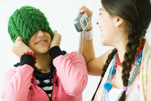Woman playfully pulling friend's knit cap down over her eyes © Laurence Mouton