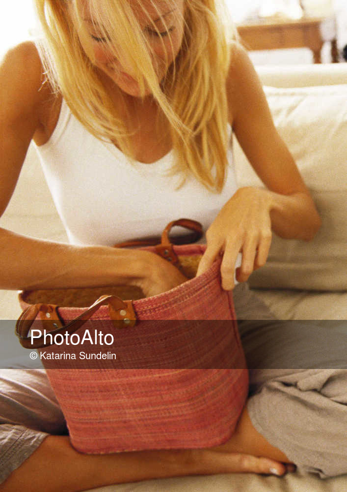 Woman sitting indian style on bed looking through bag. © Katarina Sundelin