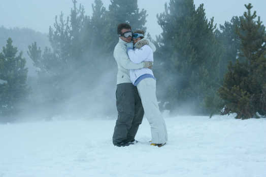 Woman standing at counter covered with vegetables, man behind woman with arms around her waist © Vincent Hazat