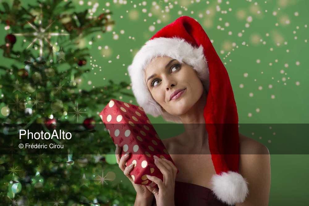 Woman wearing Santa hat and holding Christmas present, portrait © Frédéric Cirou