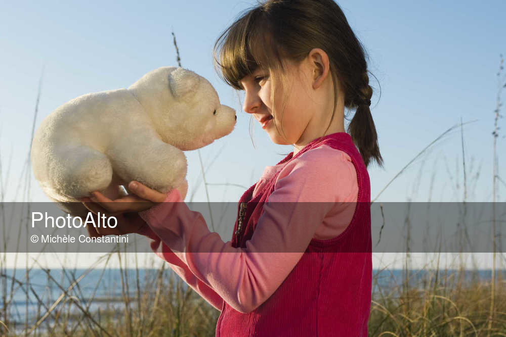 Young girl face to face with stuffed toy polar bear cub © Michèle Constantini