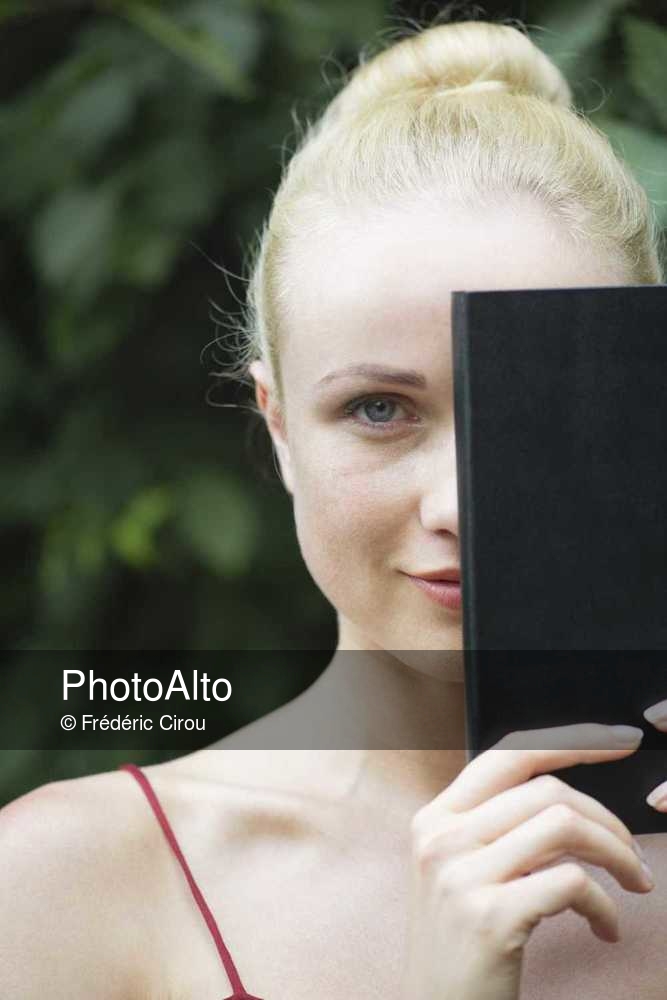 Young woman holding book in front of face, portrait © Frédéric Cirou