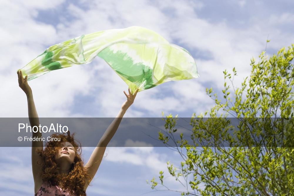 Young woman holding scarf up in breeze © Frédéric Cirou