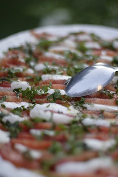 Young woman holding up a plate of tomato mozzarella salad, smiling at camera © Rafal Strzechowski