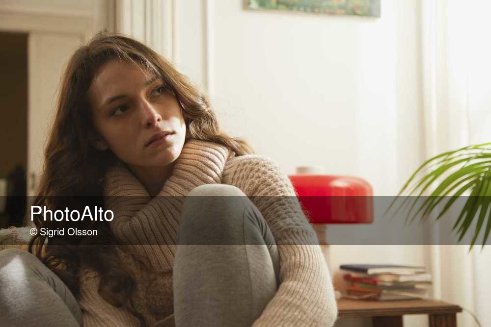 Young woman hugging knee, looking away in thought © Sigrid Olsson