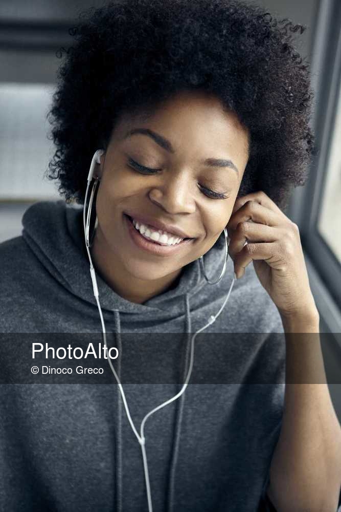 Young woman listening to earphones with eyes closed © Dinoco Greco