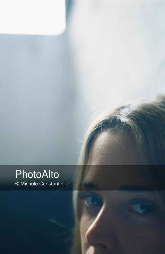 Young woman looking at camera, backlit, cropped view © Michèle Constantini