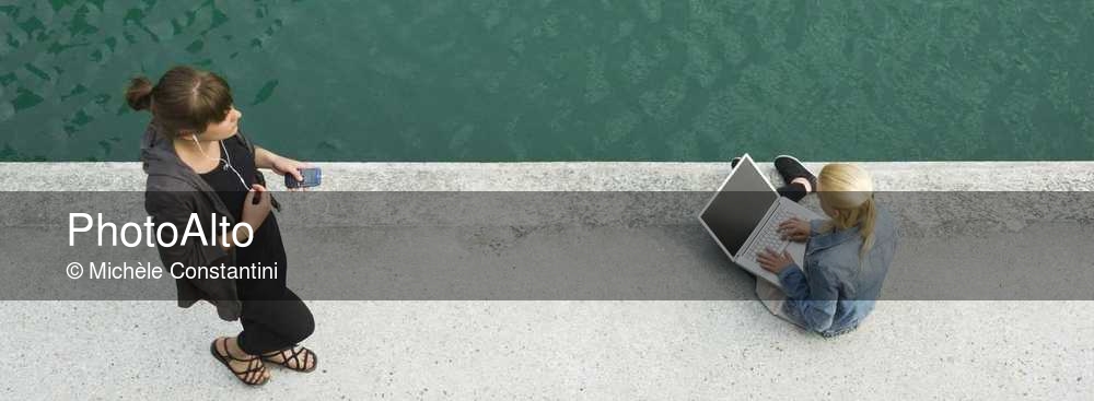 Young woman sitting beside canal, using laptop computer, elevated view © Michèle Constantini