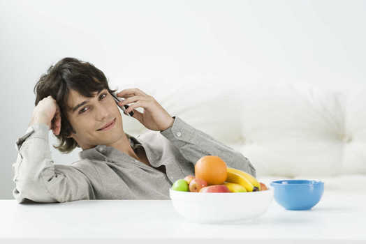 Young woman sitting, resting head on hand, holding cell phone, looking at camera © Laurence Mouton