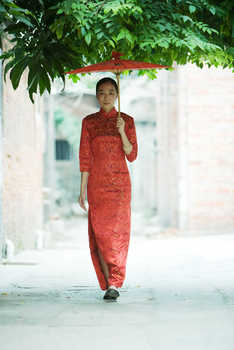 Young woman wearing traditional Chinese clothing, walking with parasol © James Hardy