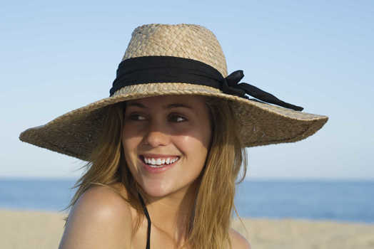 Young woman with long hair wearing sun hat on beach, waist up © Alix Minde